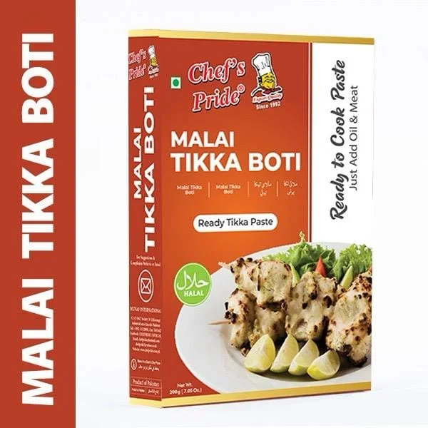 Zaruri Mart Malai Tikka Boti Masala is a creamy, mildly spiced marination mix that helps you prepare soft, juicy, and flavorful tikka botis with ease. Made with a rich blend of dairy powder, herbs, and spices, this coating mix brings out a smooth, melt-in-the-mouth texture and a subtle smoky flavor. Just mix with yogurt or cream, marinate your chicken cubes, and grill, bake, or fry for perfect results every time. Ideal for BBQs, parties, or everyday meals, Chefpride makes restaurant-style malai tikka possible at home—quickly and effortlessly.